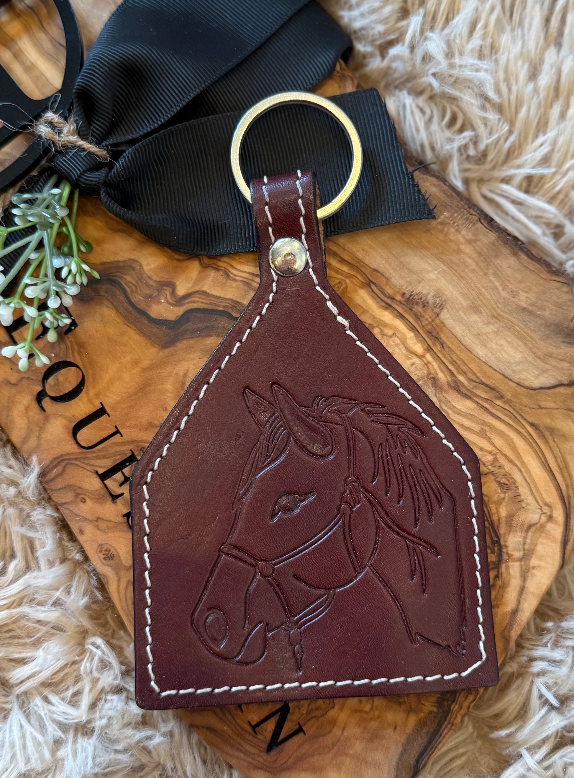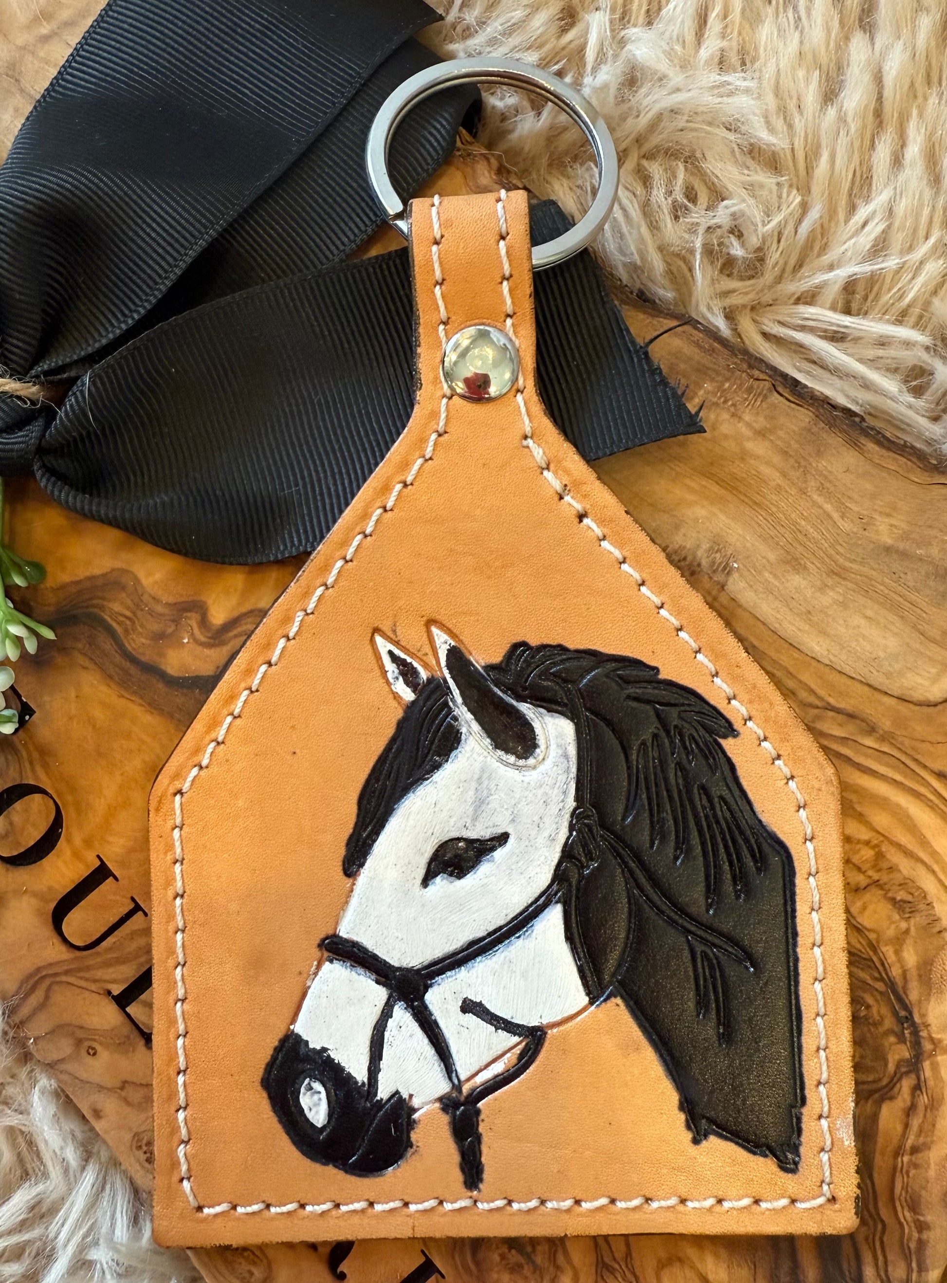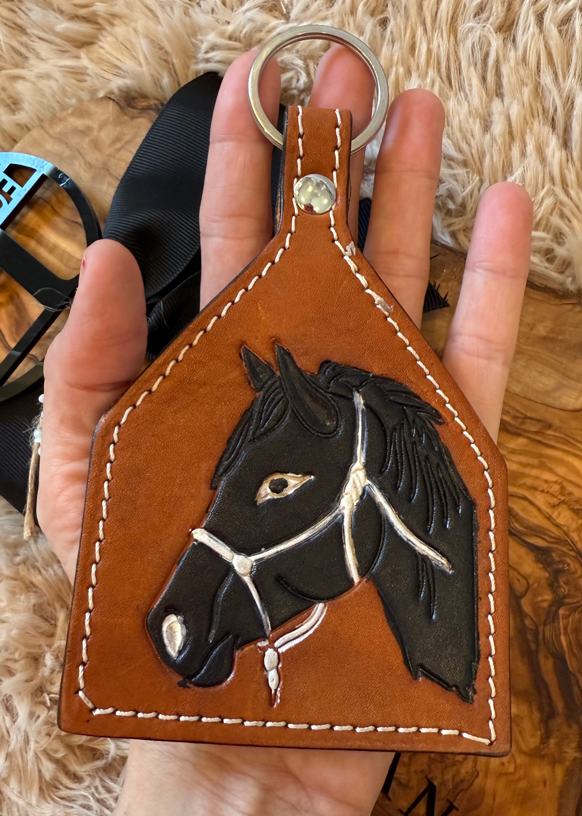 The tooled leather horse head keychain is a must! Whether it’s for your tack bag, hand bag or suitcase!