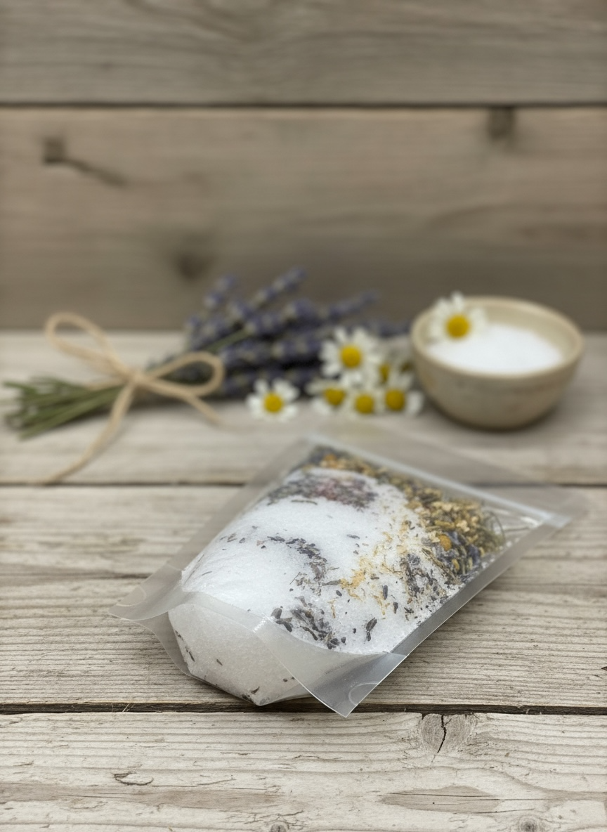 Ingredients: Epsom salt, Sea salt, magnesium flakes, dried lavender, and chamomile flowers.