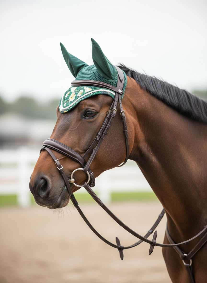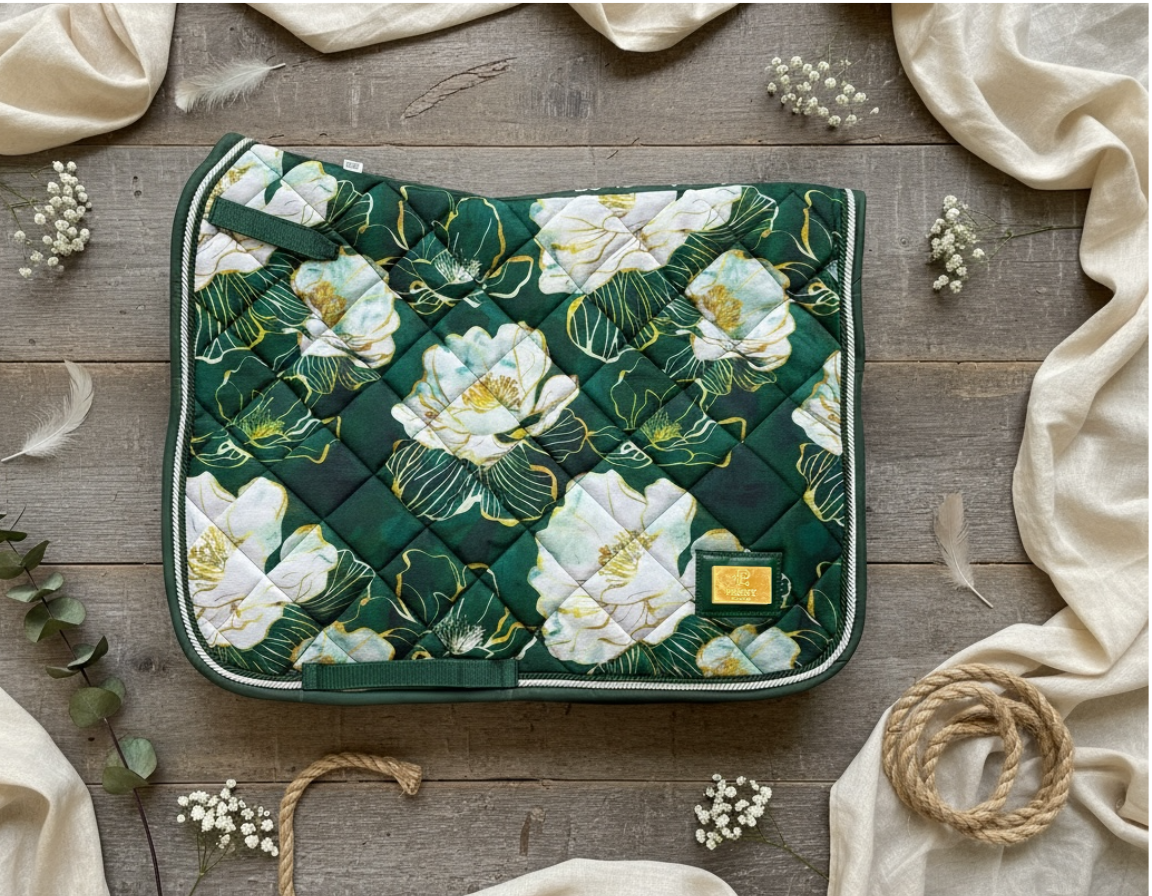This luxurious saddle pad and matching bonnet duo combines a deep emerald green base with delicate ivory floral accents, creating a look that’s both timeless and modern.