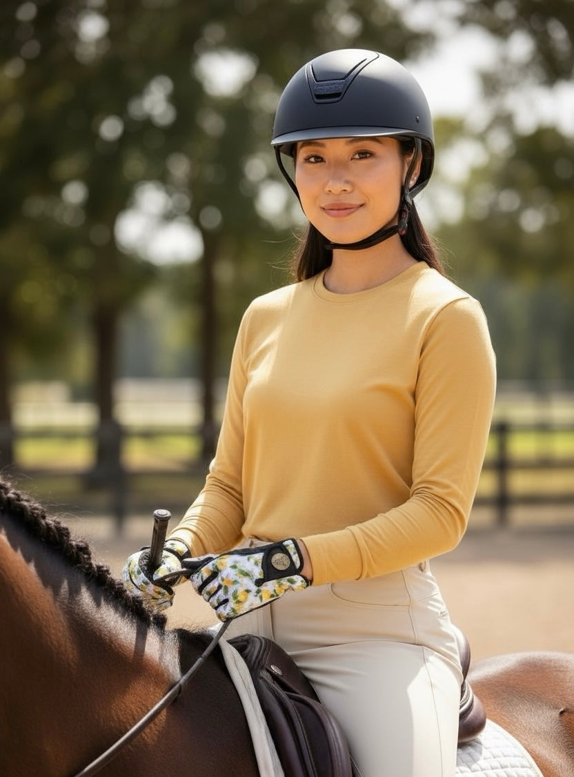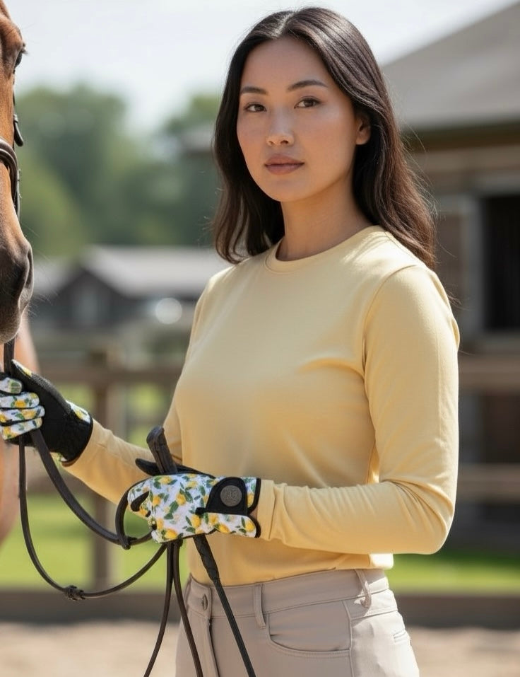 The supple faux leather palm offers a secure, grippy feel on the reins, while the breathable stretch fabric on top moves effortlessly with your hand. Finished in a signature Penny Equestrian logo, they blend modern elegance with practical comfort—perfect from schooling ring to show ring.