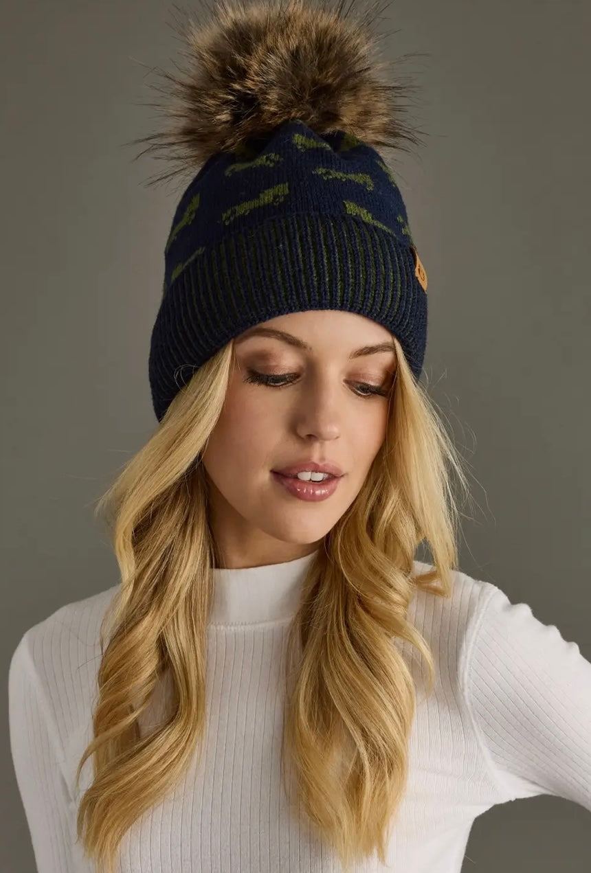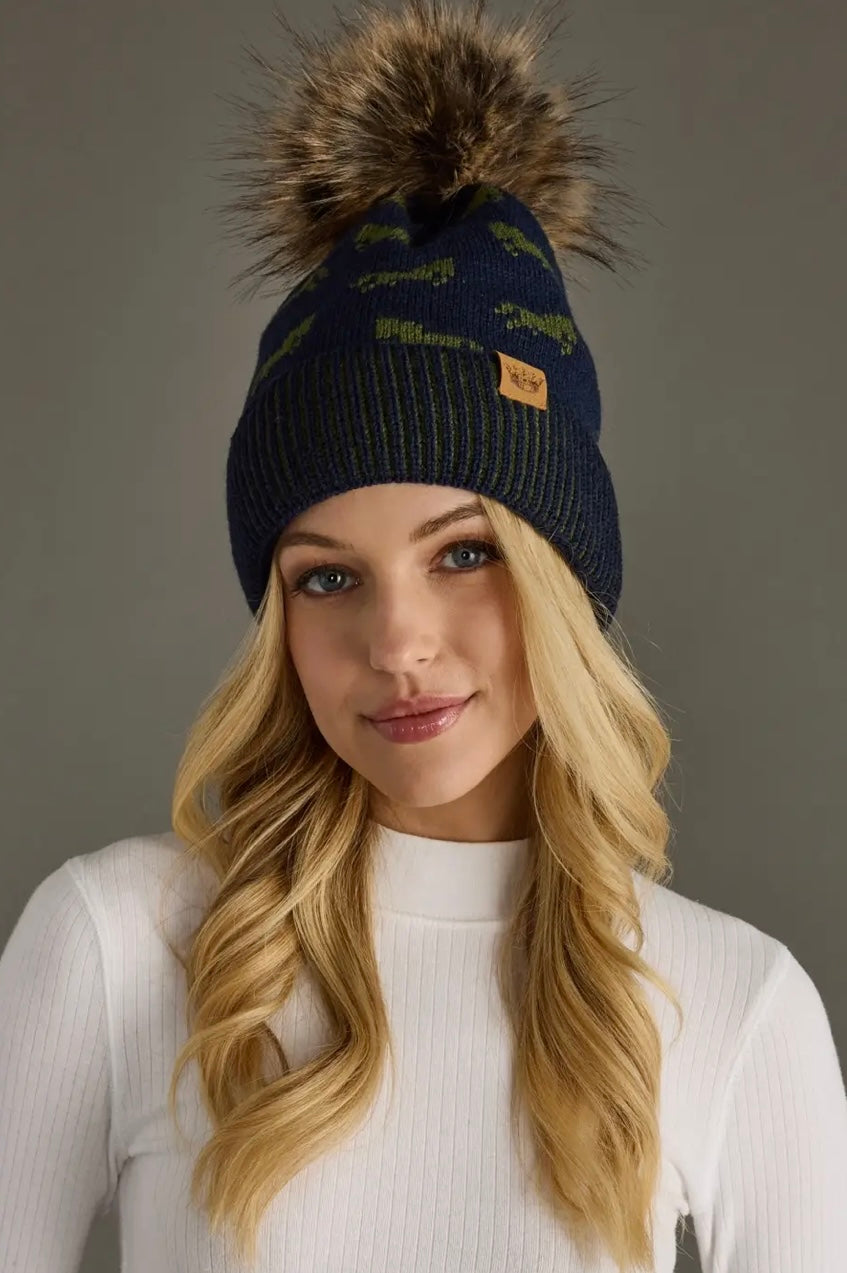 This stunning navy and green horse pattern knit pom hat is a perfect addition to your winter wardrobe!