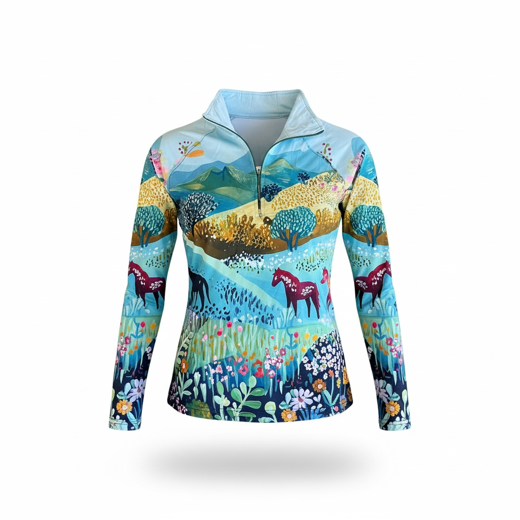 This natural UPF sun shirt features a dreamy, storybook-inspired landscape filled with rolling hills, wildflowers, and grazing horses. The scenic horse motif flows seamlessly across the body and sleeves, giving it an artistic, boutique look.