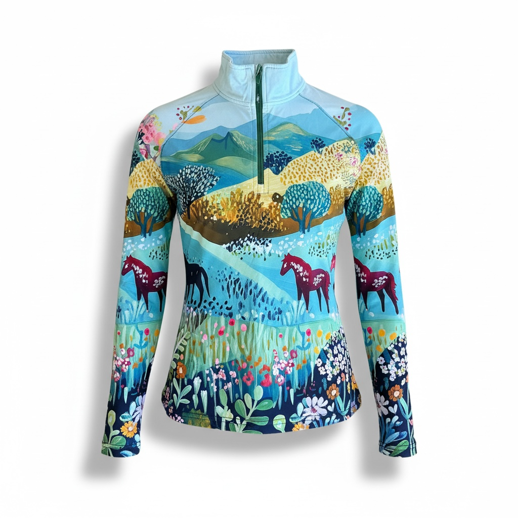 Designed with a lightweight, breathable fabric that provides natural UPF protection, this shirt helps shield skin from the sun without harsh chemical treatments. The long sleeves and mock neck with quarter zip offer extra coverage while keeping it comfortable for riding, barn days, or everyday wear. A perfect blend of function and art—ideal for equestrians who love subtle color, nature, and timeless style.