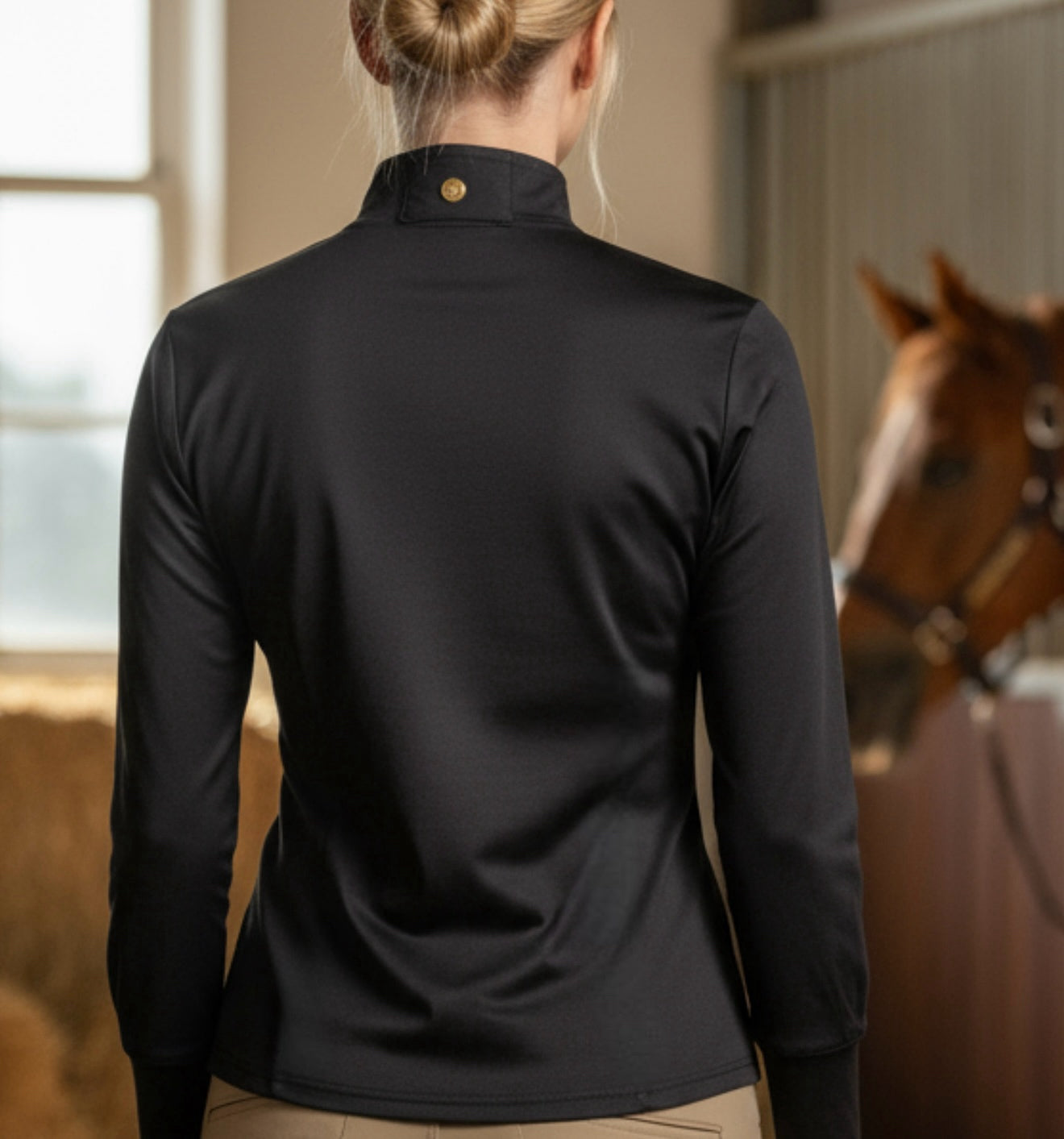 Elevate your ride with understated elegance. The Onyx Edition Midweight quarter zip combines technical performance with refined equestrian style. Crafted from a smooth, midweight stretch fabric, it offers just the right balance of warmth and breathability — perfect for cool mornings or transitional weather.